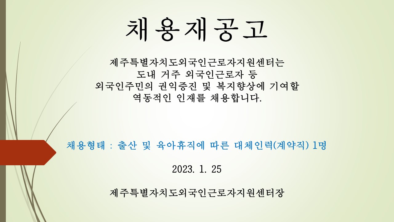| [제주특별자치도외국인근로자지원센터]출산 및 육아휴직에 따른 대체인력(계약직) 채용 공고 (0) | 2023.01.06 |