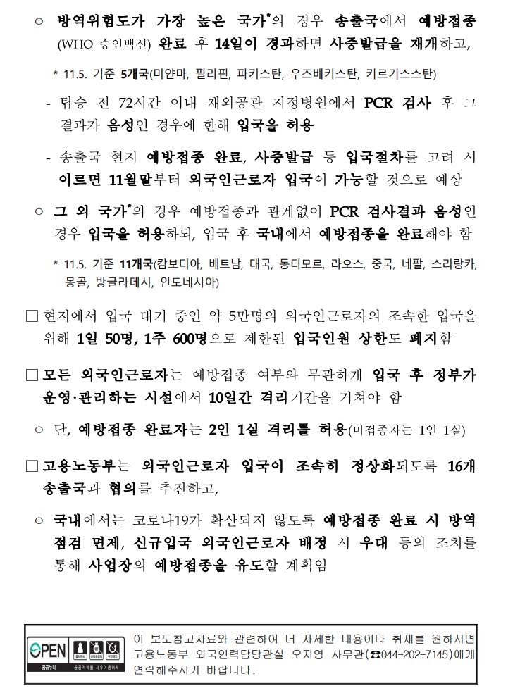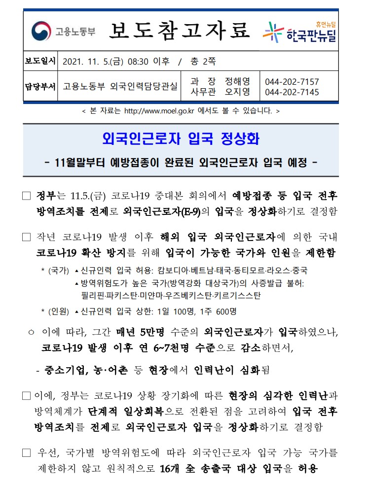 | 2021. 12. 31.(금)까지 국내 백신접종을 완료한 불법체류 외국인은 향후 자진출국 시 범칙금 면제 및 입국규제 유예(단, 형사범 및 방역 수칙 위반자 등은 제외) (0) | 2021.12.02 |