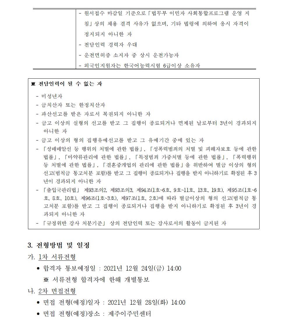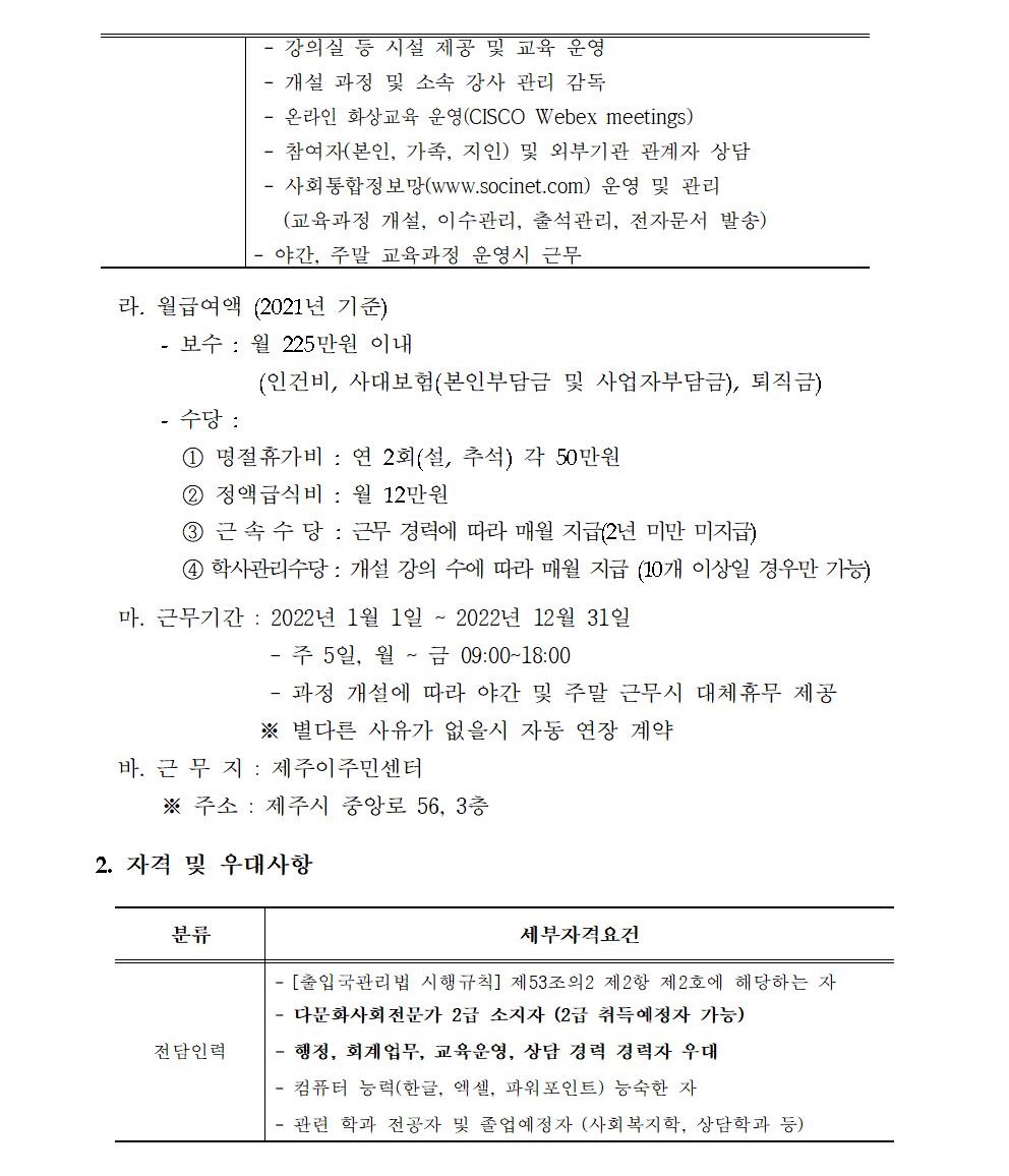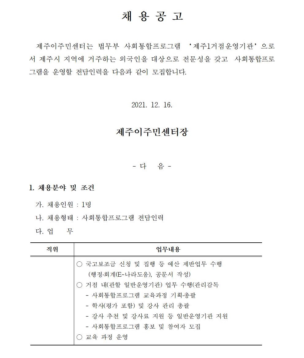 | 제주이주민센터 법무부사회통합프로그램 전담인력 채용공고 (0) | 2022.07.07 |
