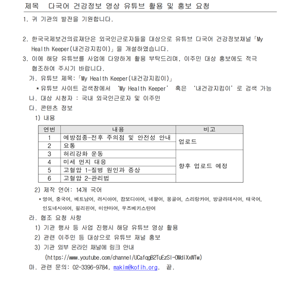 (중국어)我的健康守护神 - 面向生活在韩国的外国劳务人员的健康信息视频 - - YouTube