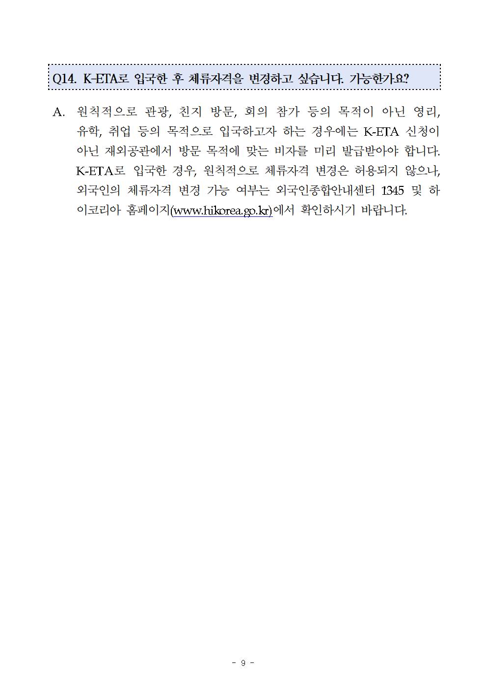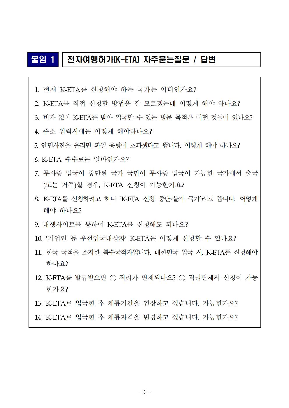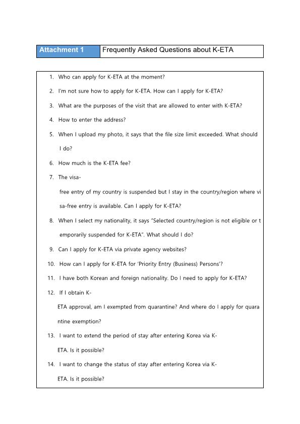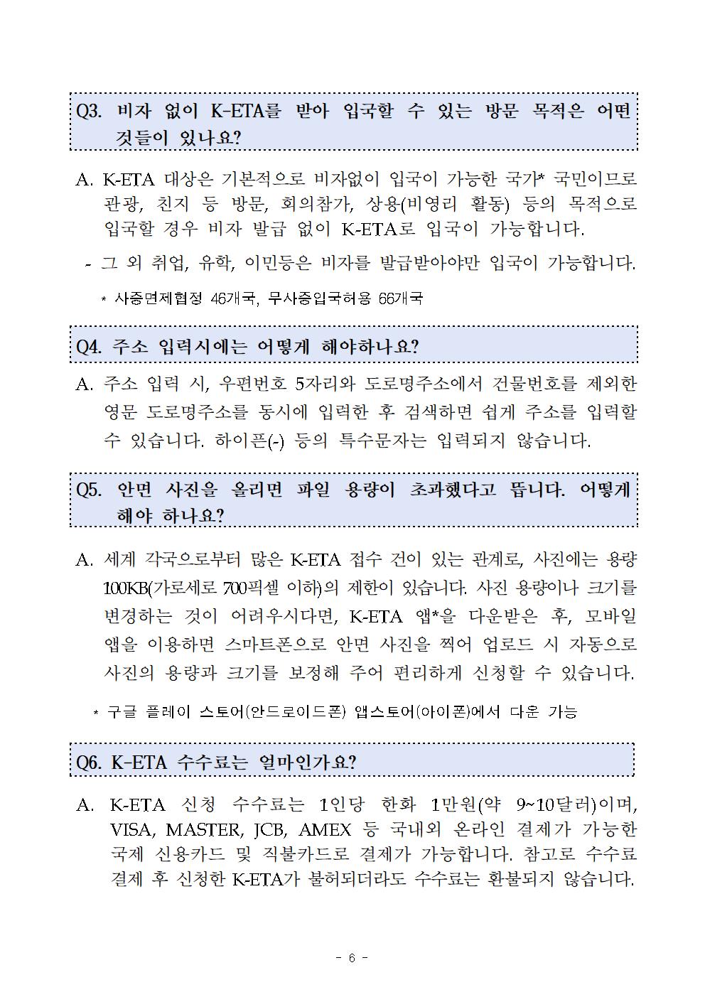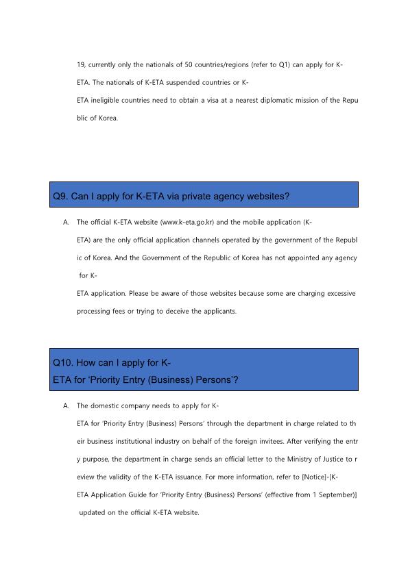 법무부에서는 그간 전자여행허가(K-ETA) 센터에 접수된 민원인들이 궁금해하는 질문내용과 답변을 정리하여 신청인들이 더욱 쉽고 편리하게 전자여행허가(K-ETA)를 이용할 수 있도록하였습니다.