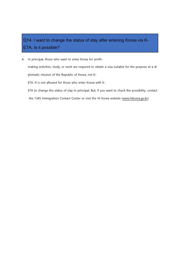 ※ 신청 중 궁금하신 점이 있을 경우 언제든지 전자여행허가(K-ETA) 웹사이트의 ‘문의하기’ 또는 K-ETA 센터로 전화(02-2666-0463) 주시기 바랍니다.