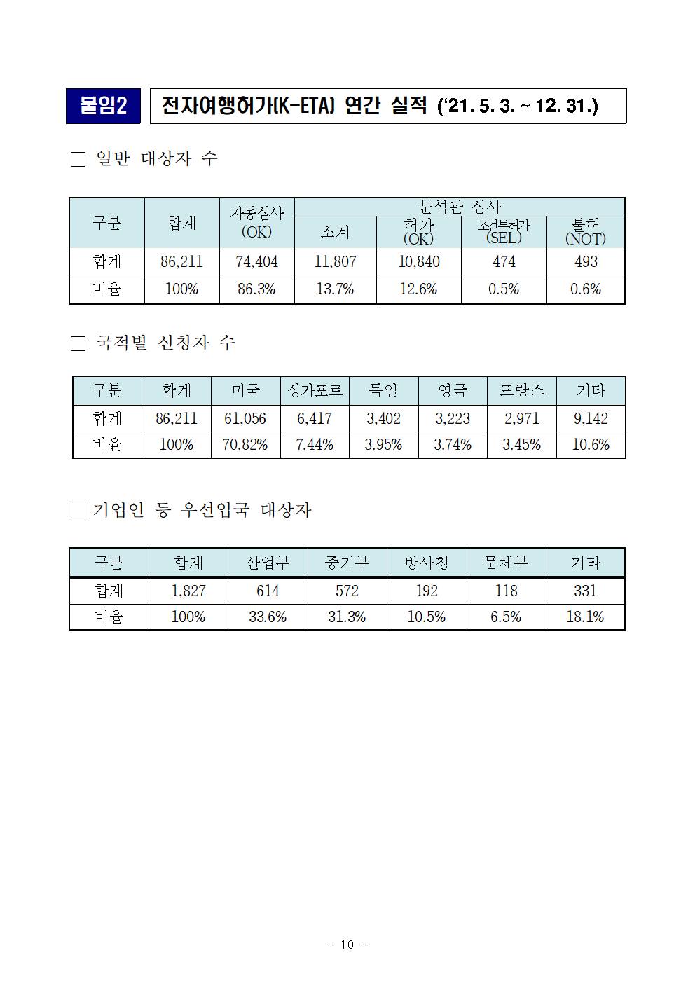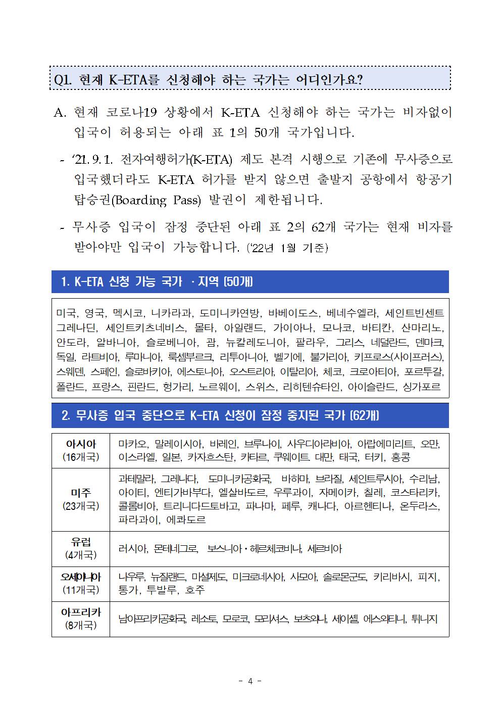 -전자여행허가(K-ETA) 제도는 세계 5번째, 아시아 최초로 도입된 제도로써, ‘21.5.3. 부터 시범운영을 거쳐 ’21.9.1. 본격시행(의무화)에 들어갔으며, 코로나19 영향으로 현재 50개국을 대상으로 시행 중에 있습니다.