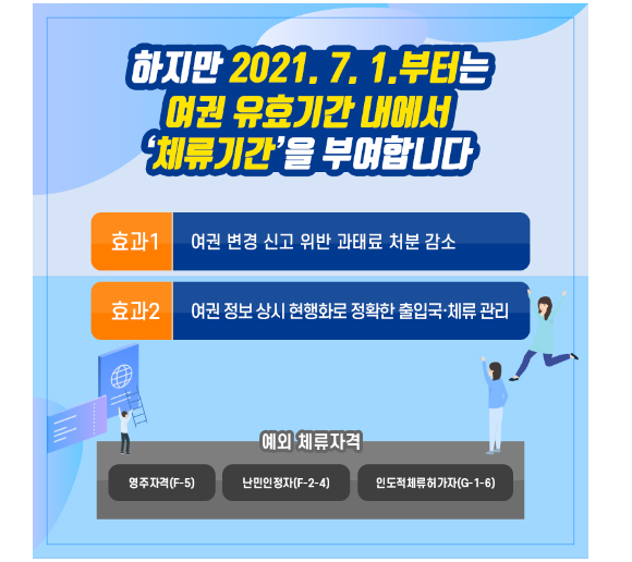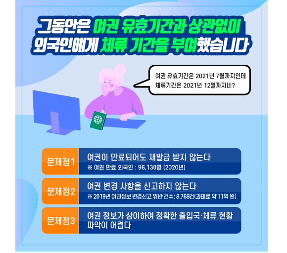 2021. 7. 1부터 "1회에 부여하는 체류기간을 여권 유효기간 만료일까지로 제한"하는 정책을 시행합니다.